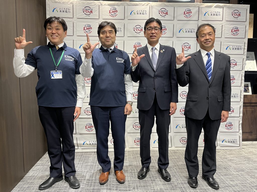 ▲写真左から:小野塚 勝俊所沢市長、ところざわ未来電力 中村 俊明代表取締役、西武ライオンズ 奥村 剛代表取締役社長、西武ライオンズ 飯田 光男球団本部長