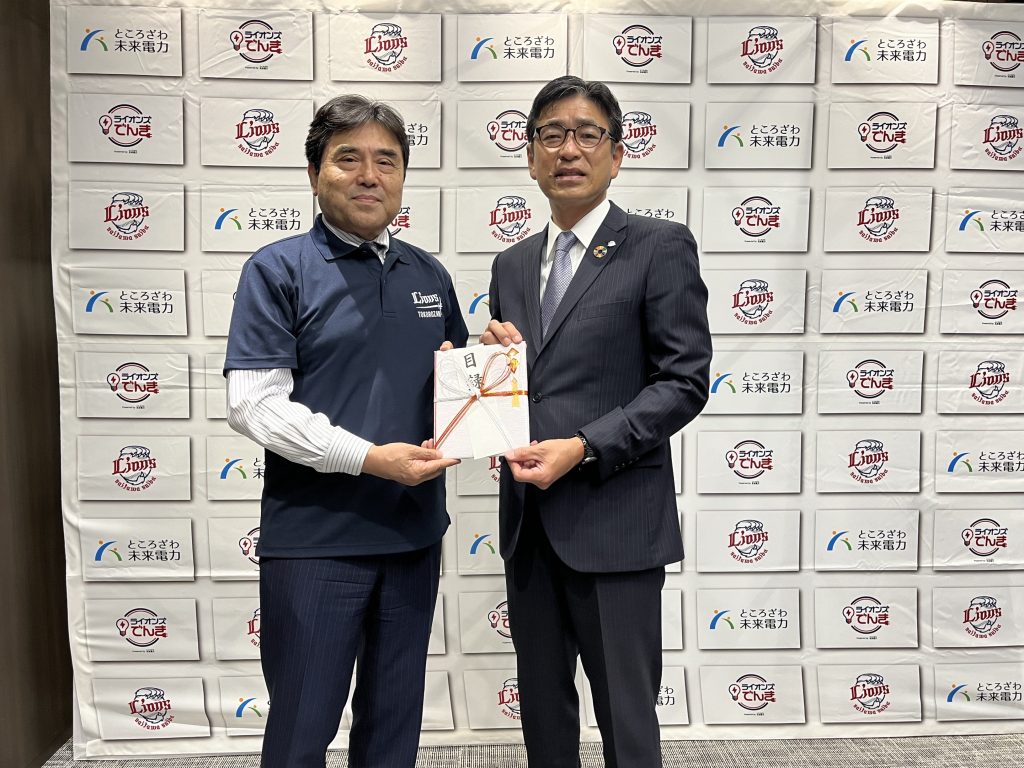 2024年4月2日、「ライオンズでんき」にご加入頂いた皆さまから2023年にお支払い頂いた電気料金約1%分を当社代表取締役の中村より、西武ライオンズ奥村代表取締役社長に目録として贈呈いたしました。